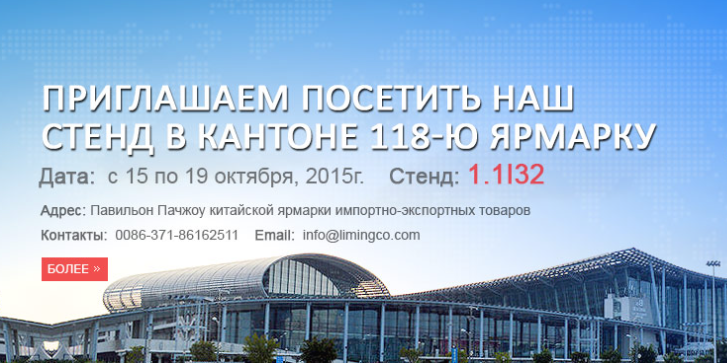 Как наиболее профессиональный производитель горных машин в Китае, Хэнаньское научно-техническое предприятие тяжелой промышленности ЗАО «Лимин» (LIMING©) будет присутствовать на китайской ярмарке импортных и экспортных товаров и принять передовые технологии в китайской ярмарке. Это будет совершенно новая возможность для отображения технологии и прочность нашей компании.